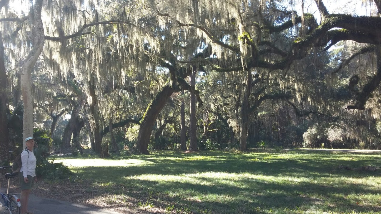 We've met some very kind people along our way today. Cornelia's husband finally found us (and Ken, too?) along our way. He drove to get us a bike. Not sure what Ken was doing. Some young man gave David a ride to the next intersection and I rode the bike. Later in the day we re-met Yvonne, the Interpretive Guide from yesterday whose husband might have given us a private (less expensive) island tour had we been able to reach them soon enough this morning. Yvonne told me that when they are in the village (farther away from the mainland) the cell reception is lousy so she didn't get my text message until too late to accommodate us. We were totally happy on foot and on bike(s) though. Yvonne had about 19 people on her tour. She works for the State of Georgia giving tours of the island.